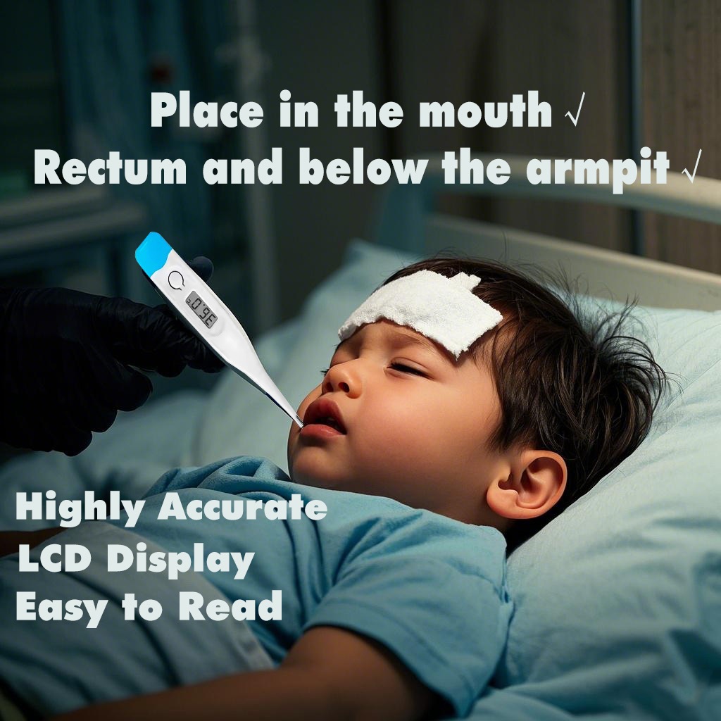 Featuring high-precision sensing technology, it delivers clear results with an easy-to-read LCD display. The thermometer beeps softly once measurement is completed for convenient use. It supports both Celsius and Fahrenheit readings, stores the last measured value for easy tracking, and automatically shuts off to save battery power.