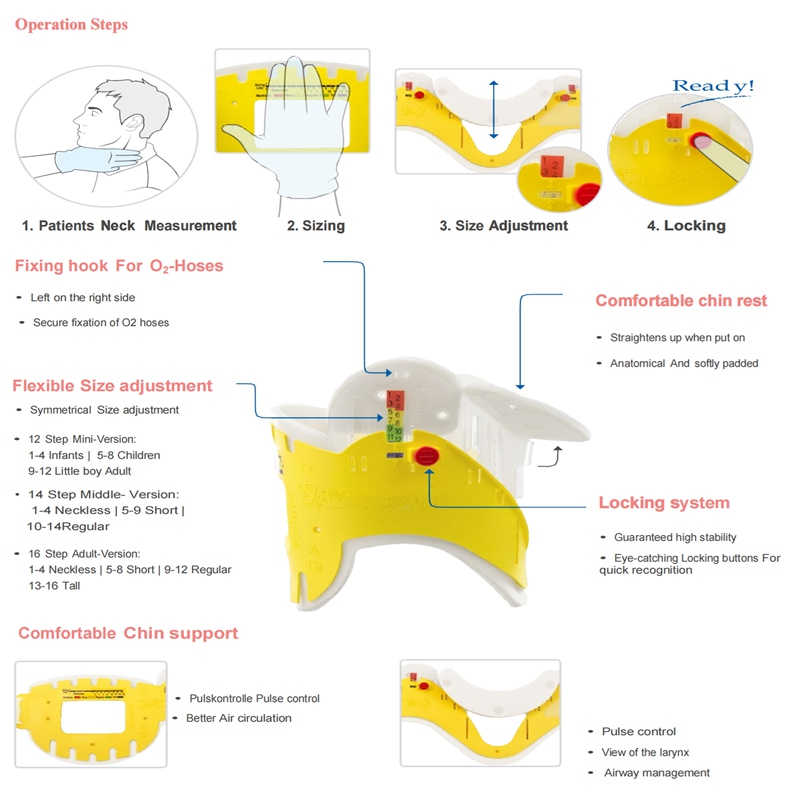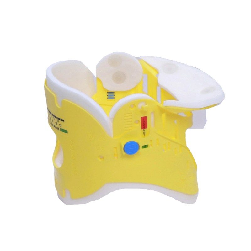This rescue cervical collar is an integrated rigid immobilization device that maintains neutral cervical spine alignment, restricts lateral, flexion and extension movement during transport and handling, and helps prevent secondary injuries.